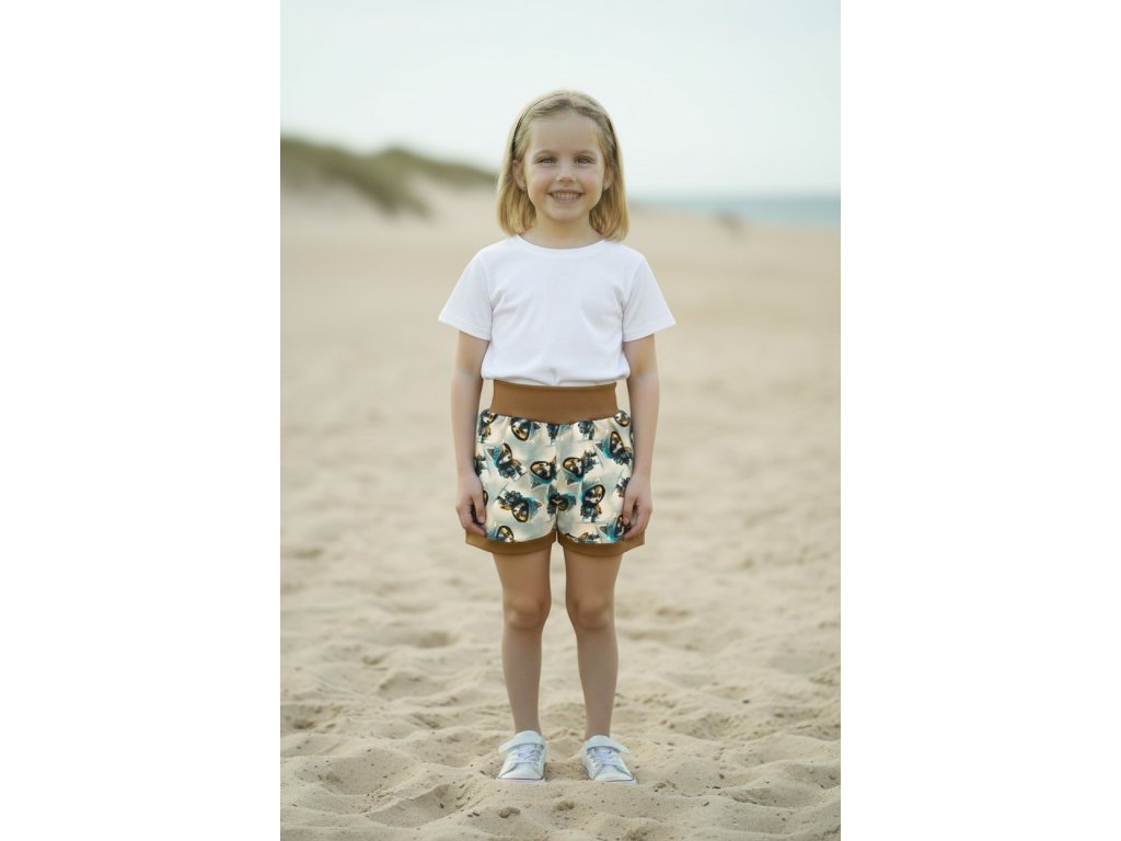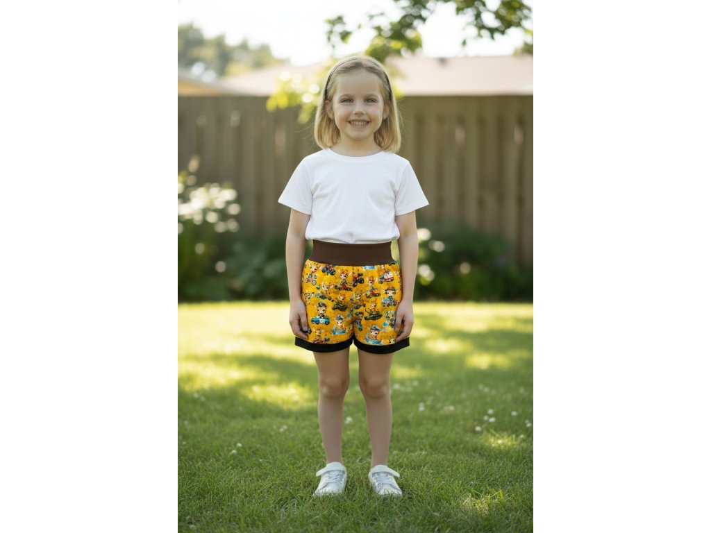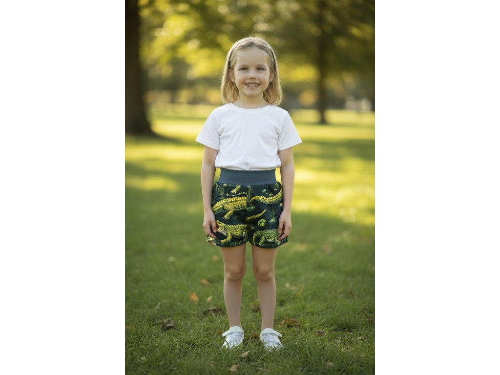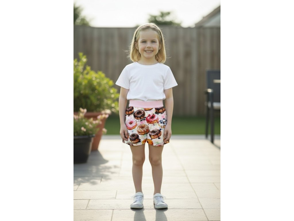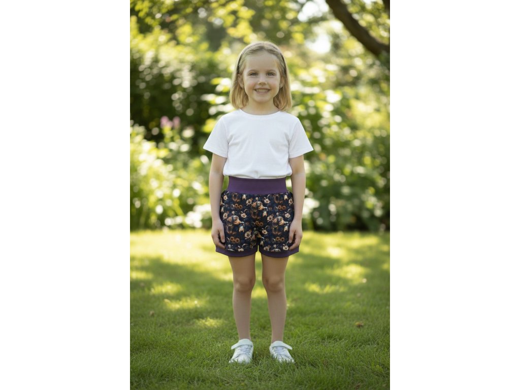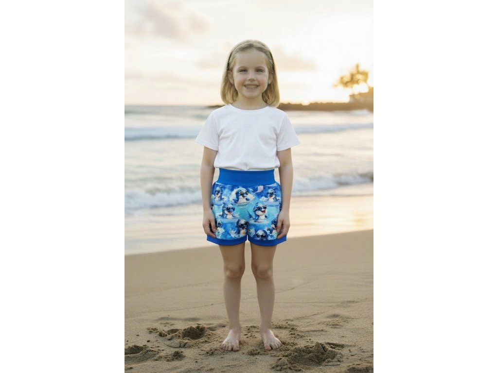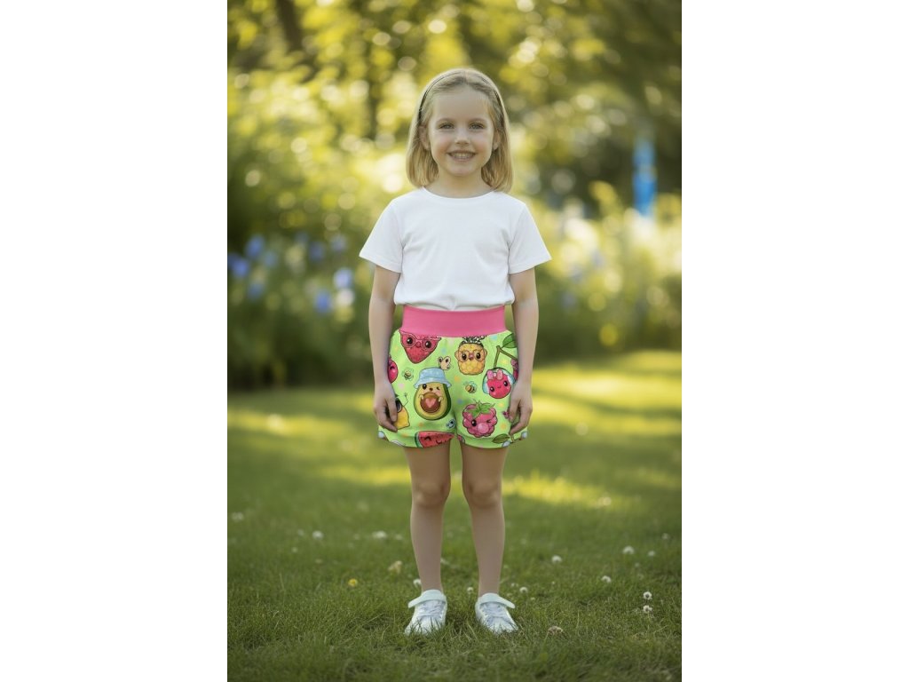 Šortky jsou ušité z potištěného úpletu. V pase do vyššího pružného nápletu s otvorem pro případné navlečení gumy. Výběr ze dvou střihů, balónový a klasický rovný. Vhodné pro kluky i holky, v různých velikostech a motivech.