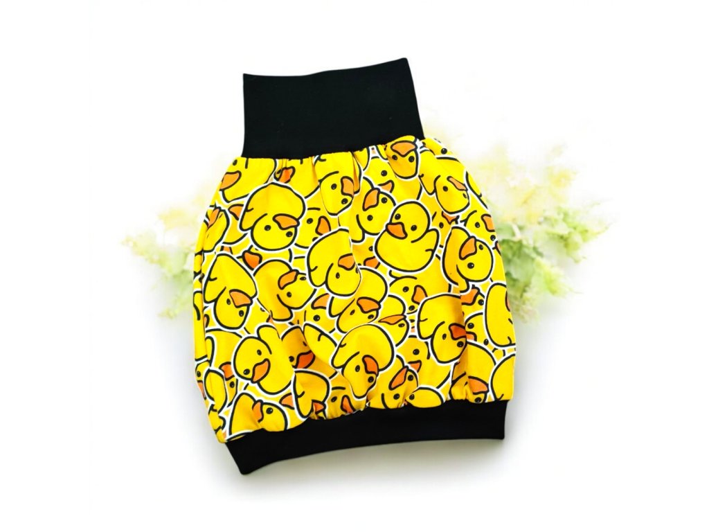 Sukně je šitá z potištěného úpletu, s balón efektem díky napletům. V pase do vyššího pružného nápletu s otvorem pro případné navlečení gumy. Rostoucí, nikde netlačí!