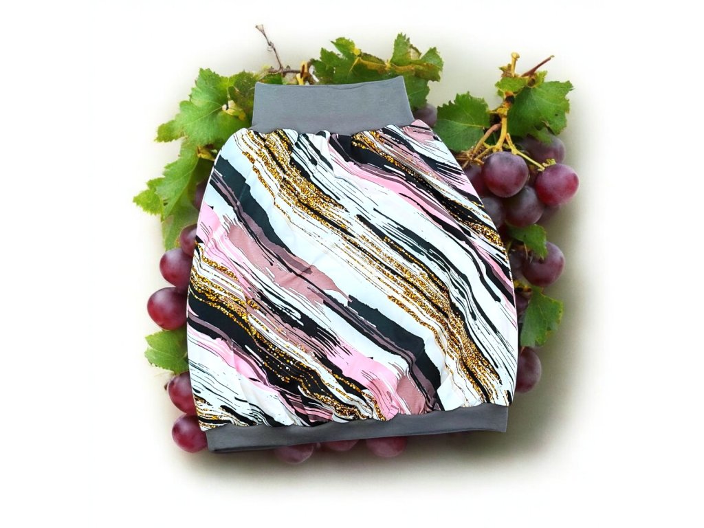Sukně je šitá z potištěného úpletu, s balón efektem díky napletům. V pase do vyššího pružného nápletu s otvorem pro případné navlečení gumy. Rostoucí, nikde netlačí!