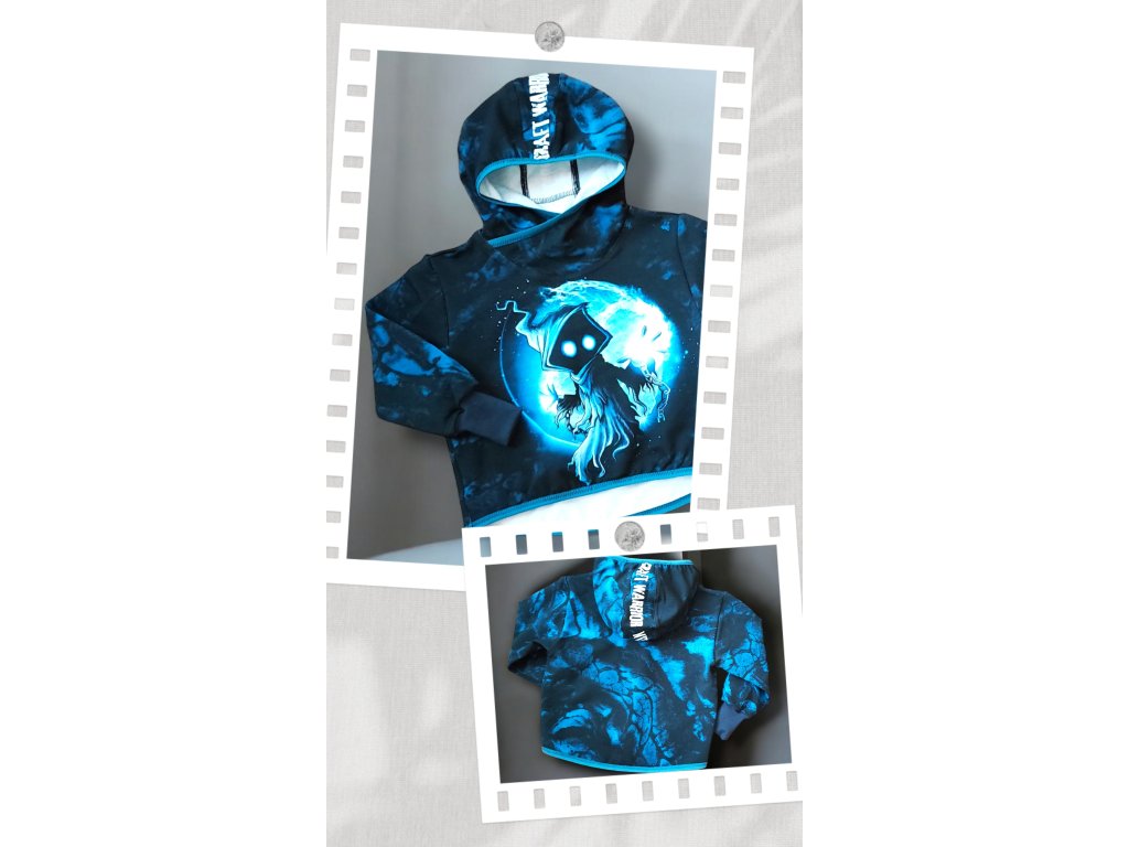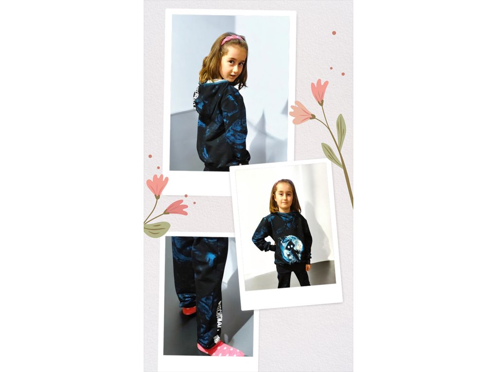 Teplákovka je ušitá z potištěné i jednobarevné teplakoviny z rubu jemná smyčka čili slabá teplakovina. Mikina je přes hlavu s kapucí, bez kapes, rukávy jsou zakončeny pružným nápletem, zadní díl je mírně prodloužený a spodní část je zakončena pružnou lemovkou. Tepláky jsou klasické, dvě kapsy, v pase do vyššího pružného nápletu s otvorem pro případné navlečení gumy, nohavice též zakončené pružným nápletem (rostoucí).