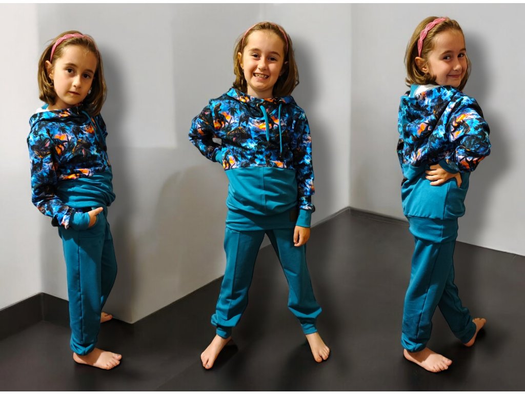 Teplákovka je šitá z potištěné i jednobarevné teplakoviny z rubu jemná smyčka, čili slabá teplakovina. Mikina je s kapucí která lze dle potřeby stáhnout olivkou, bez kapes, spodní část i rukávy jsou zakončeny pružným nápletem (rostoucí). Tepláky jsou klasické, dvě kapsy, v pase do vyššího pružného nápletu s otvorem pro případné navlečení gumy, nohavice též zakončené pružným nápletem (rostoucí).