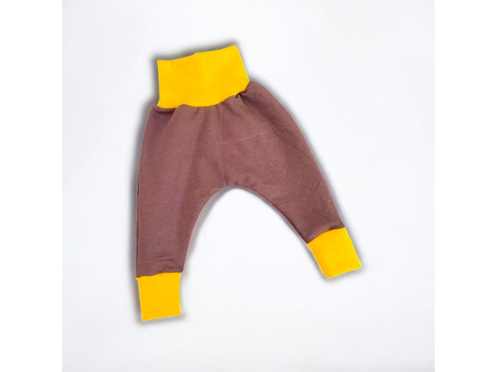 Ušito z potištěné teplakoviny z rubu jemná smyčka.V pase do vyššího pružného nápletu s otvorem pro případné navlečení gumy, nohavice též zakončené pružným nápletem, rostoucí.