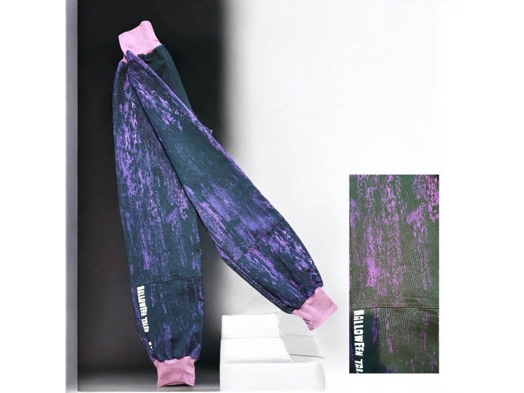 Ušito z potištěné teplakoviny z rubu jemná smyčka. Bez kapes, v pase do vyššího pružného nápletu s otvorem pro případné navlečení gumy, nohavice též zakončené pružným nápletem (rostoucí).