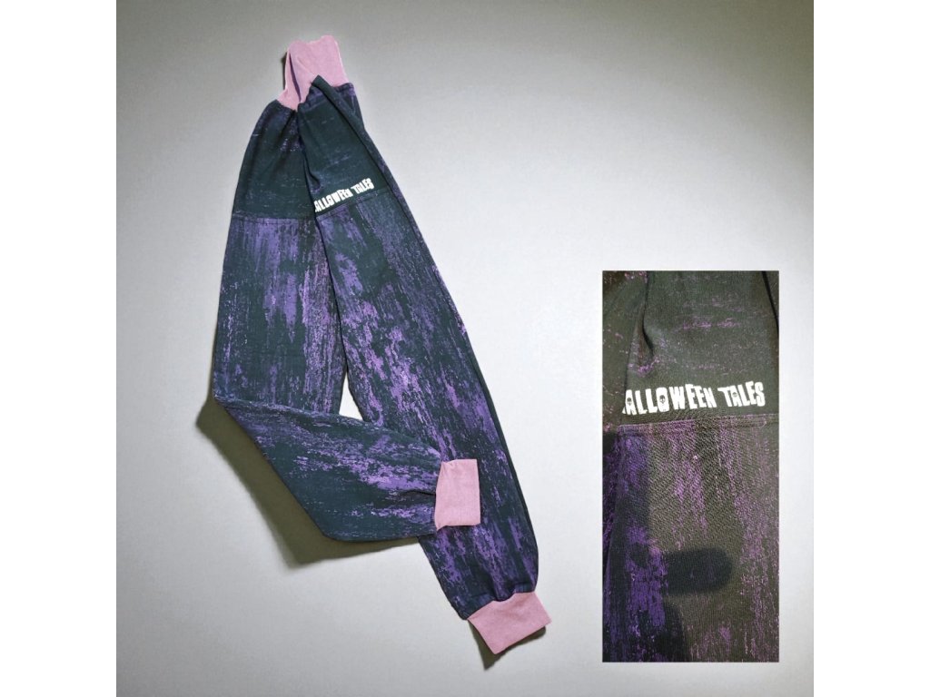 Ušito z potištěné teplakoviny z rubu jemná smyčka čili slabá teplakovina. Bez kapes, v pase do vyššího pružného nápletu s otvorem pro případné navlečení gumy, nohavice též zakončené pružným nápletem (rostoucí).
