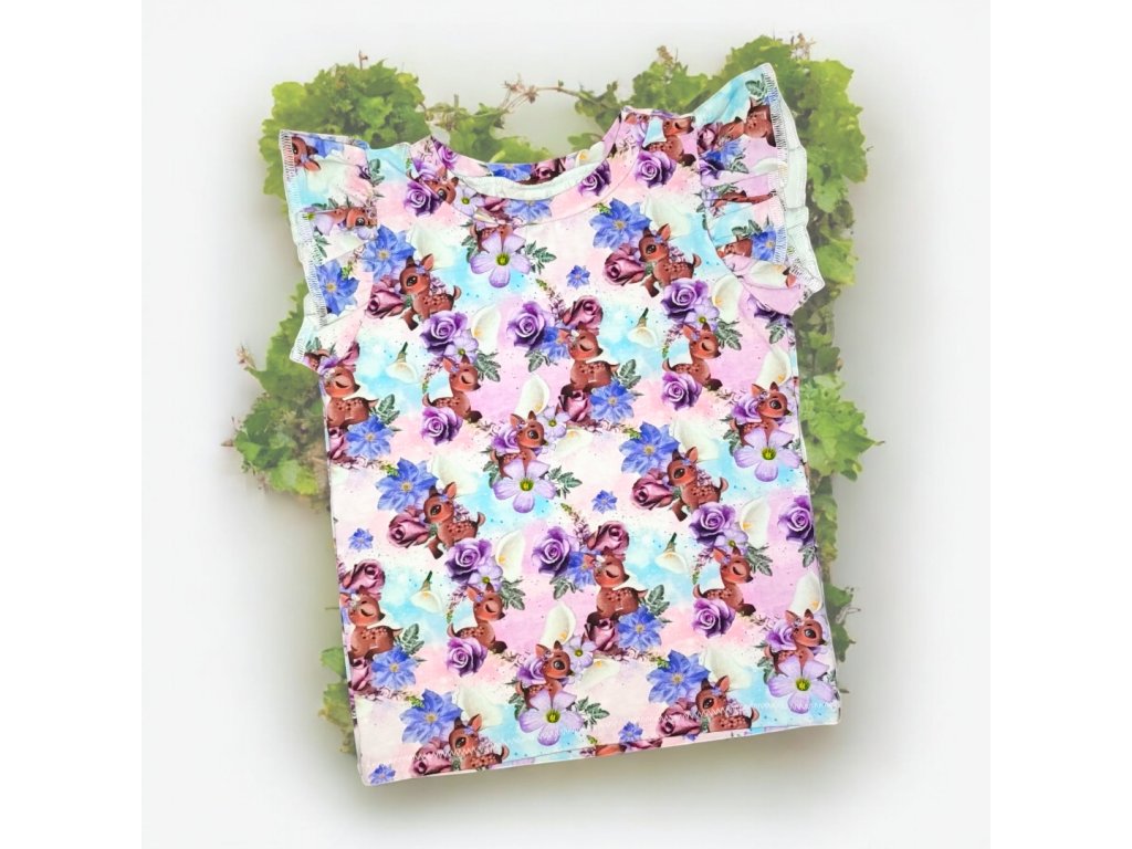 Tričko je šité z potištěného úpletu, s krátkým volánkovým rukávem, kulatý výstřih.