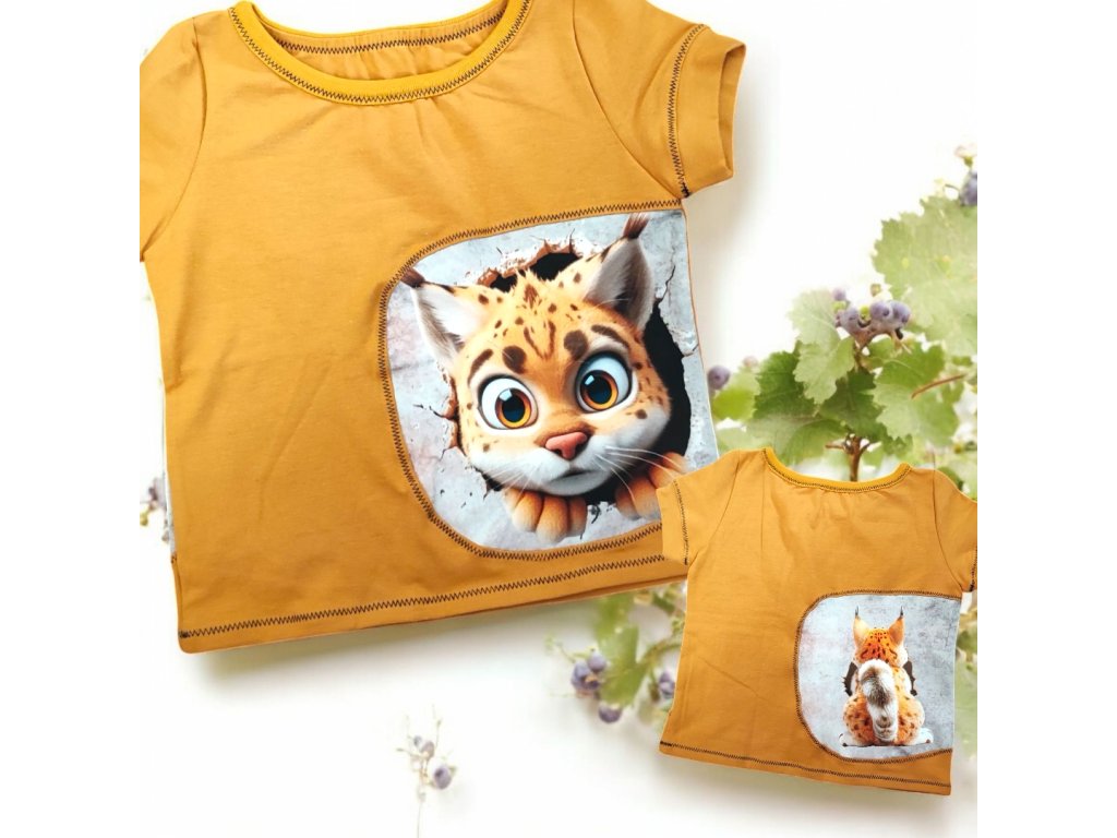 Tričko je šité z potištěného i jednobarevného úpletu, s krátkým rukávem, kulatý výstřih.