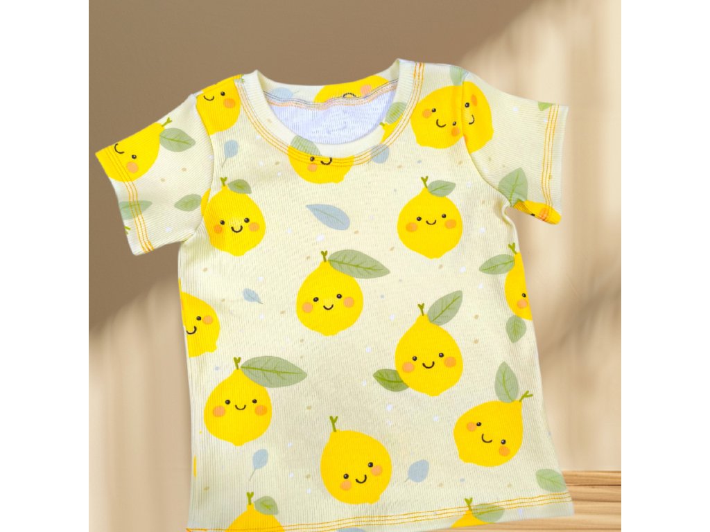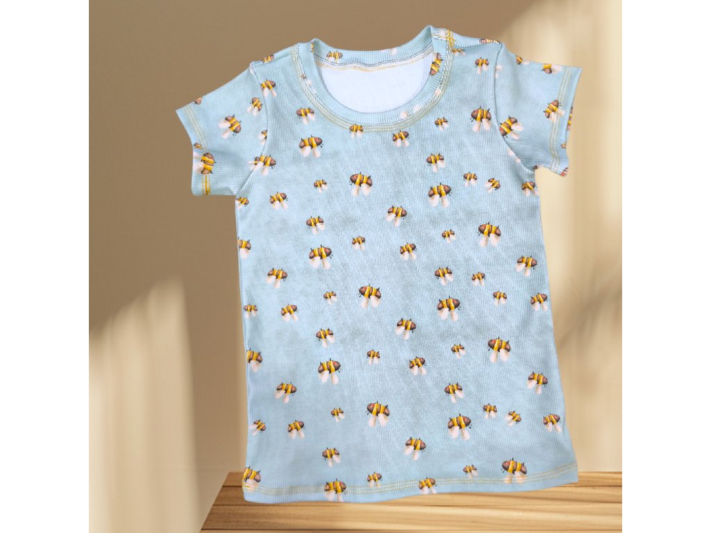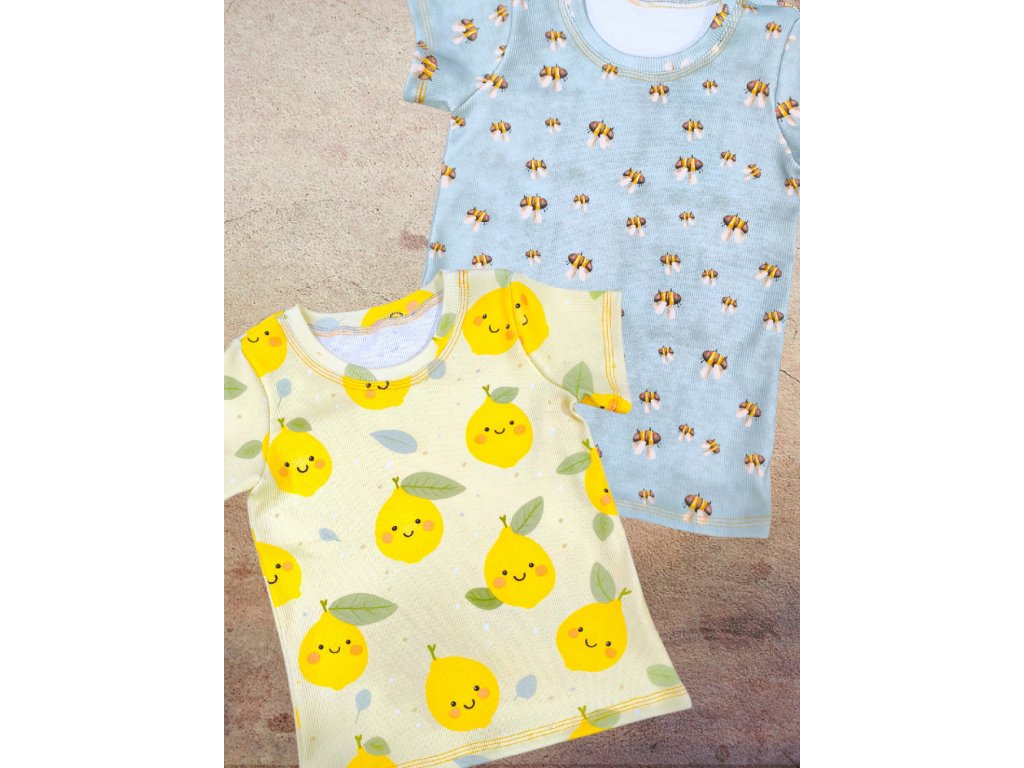 Tričko je šité z potištěného žebrovaného úpletu. S krátkým rukávem, kulatý výstřih. S roztomilými motivy, které jsou vhodné pro kluky i holky. Velmi pružný materiál a velice příjemný a oblíbený.
