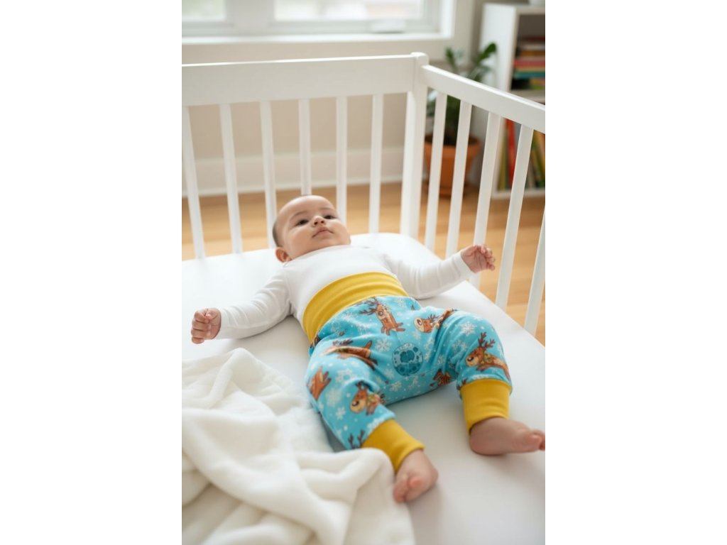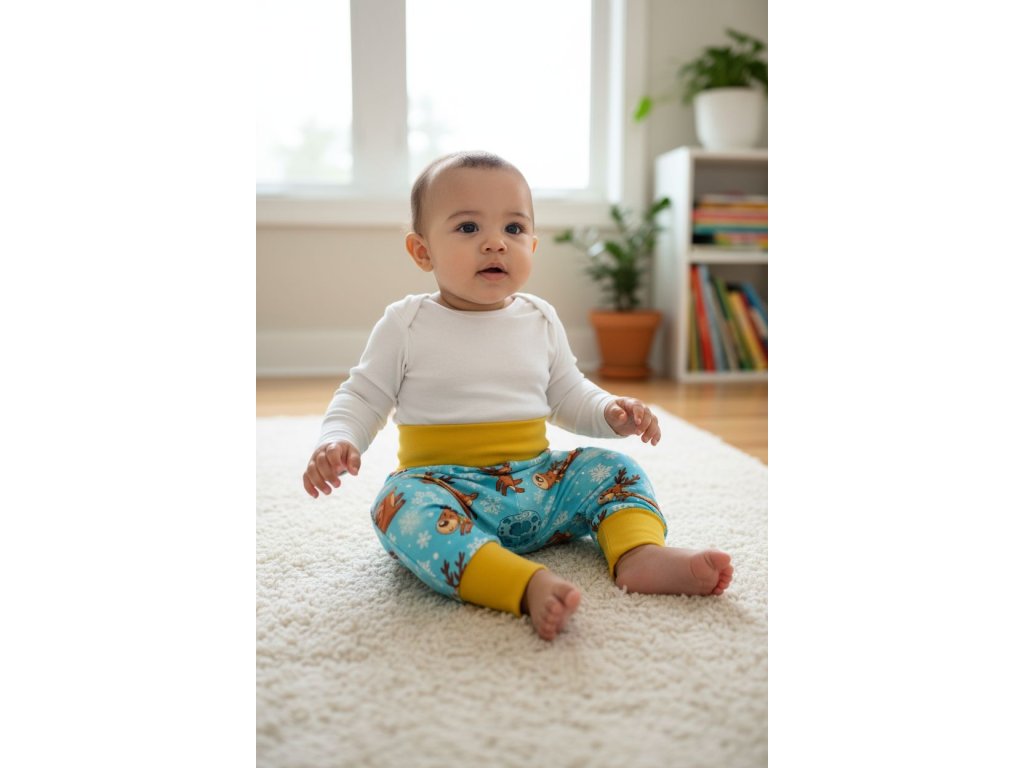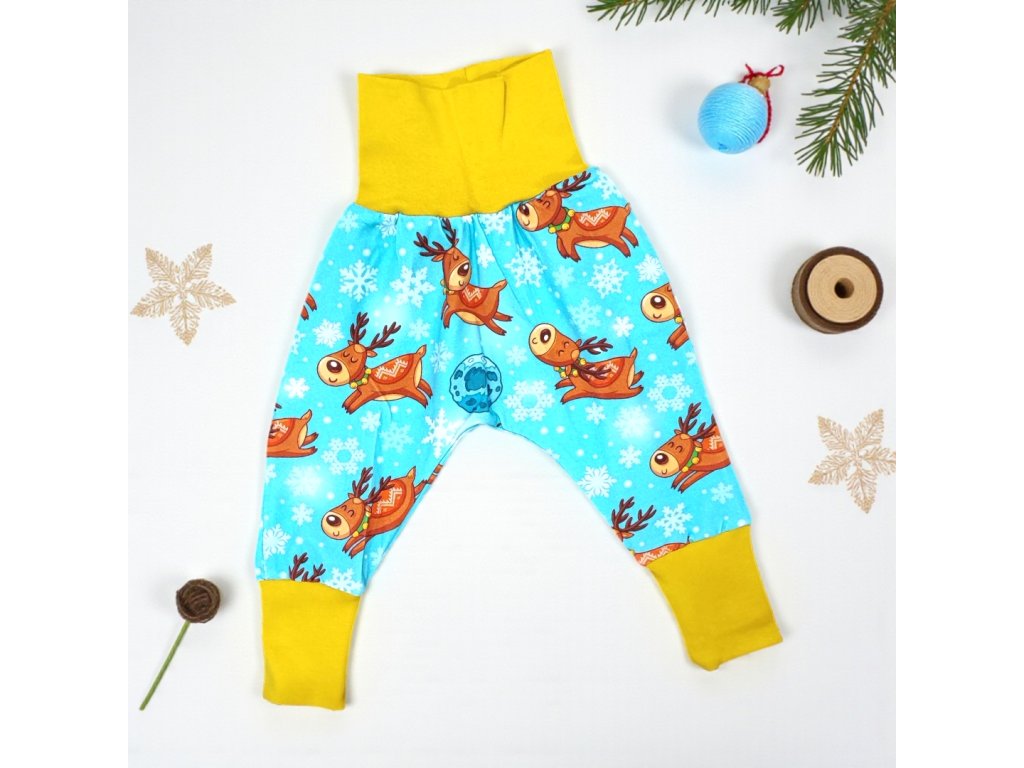 Tepláky jsou šité z potištěného úpletu. Baggy střih s kulatým rozkrokem. V pase do vyššího pružného nápletu, který se krásně přizpůsobí bříšku a nikde netlačí. Nohavice též zakončené pružným nápletem (rostoucí). S krásným vánočním motivem sobíků.