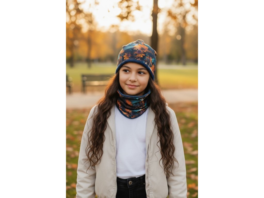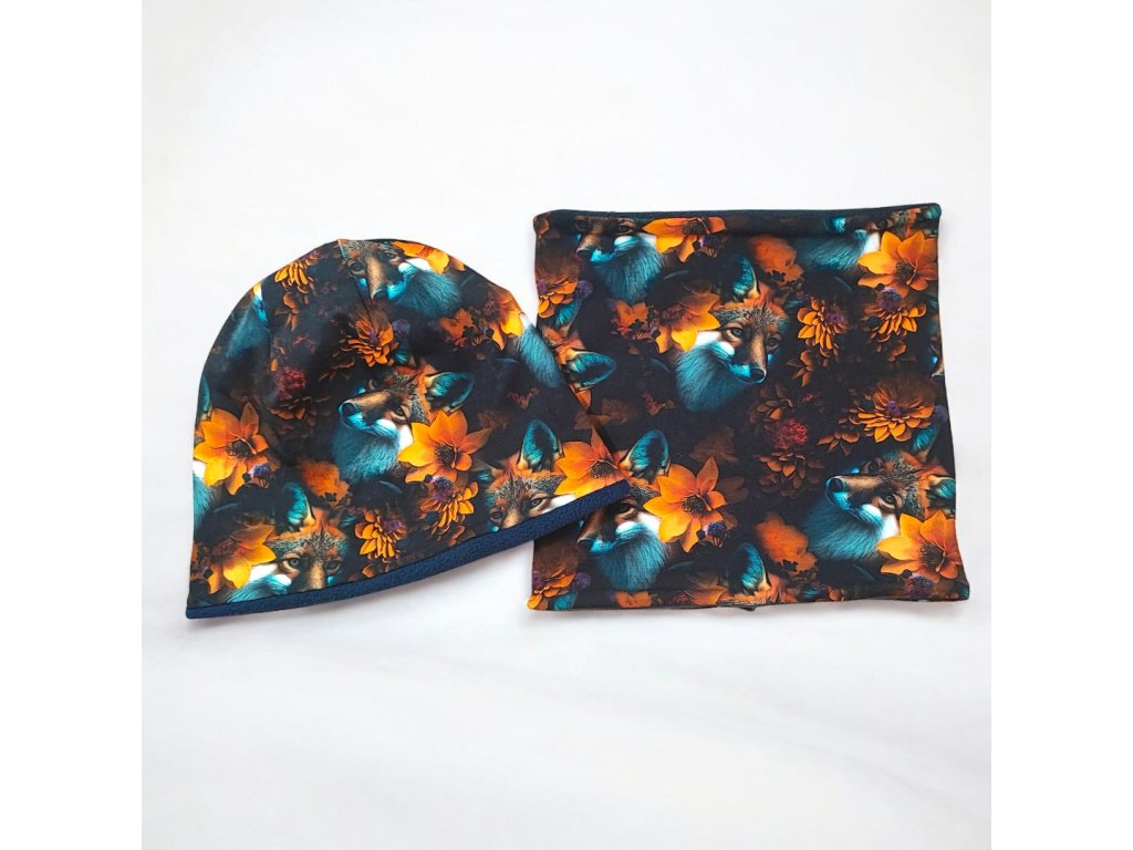 Čepice je ušitá z potištěného úpletu s flísovou podšívkou. Je klasická rovná. S decentním motivem lišek mezi květy.