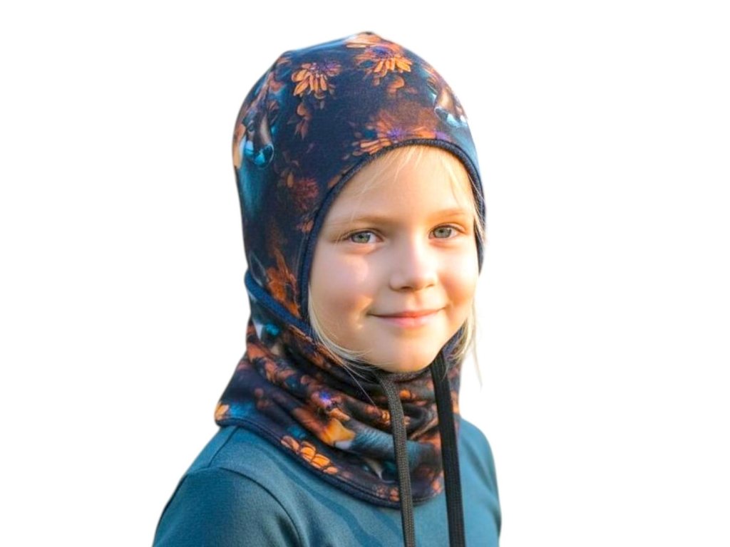 Set je ušitý z potištěného úpletu s flísovou podšívkou. Čepice je ušanka na zavazování, nákrčník je tunel. Krásný motiv lišek mezi květy.