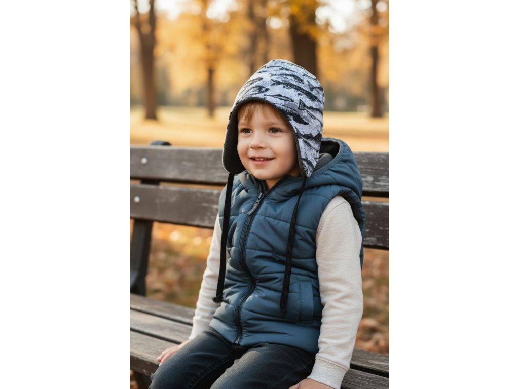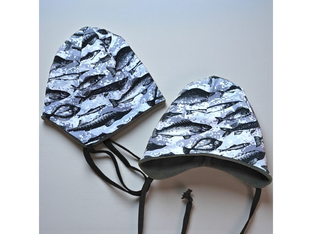 Čepice je ušitá z potištěného úpletu s flísovou podšívkou, je to ušanka na zavazování s motivem ryb pro milovníky rybaření.